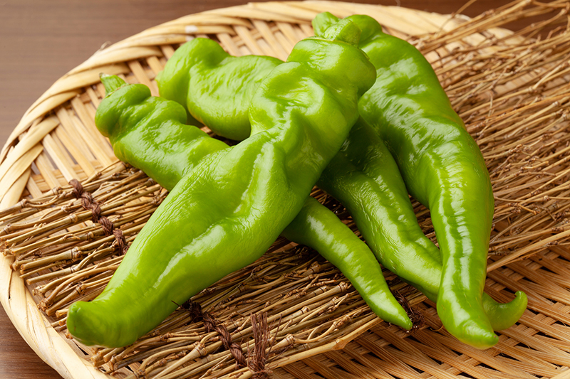 万願寺唐辛子は5月から9月に出荷される京野菜です。通常の唐辛子の5〜10倍ほどの大きさで、柔らかく甘みがあるのが特徴です。京都から入荷した万願寺唐辛子を新鮮なうちにお客様にお届けします。
