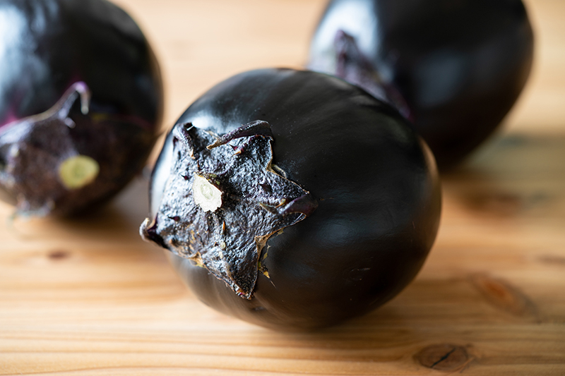 丸茄子は水分たっぷりでみずみずしい食感が特徴です。新鮮な丸茄子はヘタの部分のとげがしっかりしており、うっかり触ってしまうと怪我をしてしまうほどです。鮮度が落ちないように適した温度で出荷いたします。